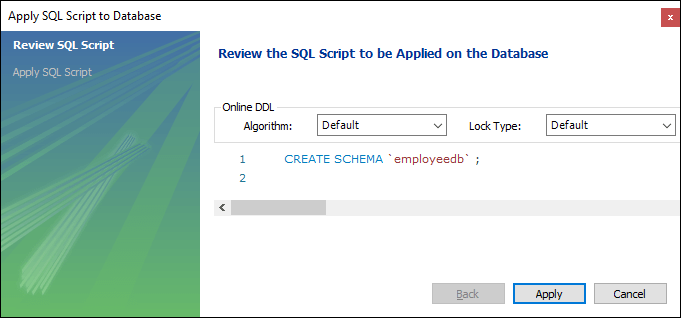 2. The new Schema window screen open. Enter the new database name (for example, employeedb) and use default character set and collation. Now, click on the Apply button as shown in the screen below: